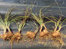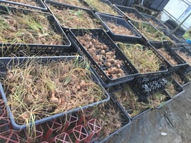鹿が葉っぱを食べてしまった球根は葉がないとやはり大きく成長はできなかったようでとっても小さな球根にしかなりませんでした。去年の大きさがニンニクとすると今年はらっきょうくらいです。前回、鹿に葉を食べられた後に夕方から朝までピカピカとライトを点滅させる撃退ランプを沢山増やしてみたり、鹿が入ったであろう場所のネットを少し高くしてみたりしたのですが・・・なんと真昼間に堂々と鹿が入っているという目撃情報を頂き少し復活した葉や残っていた葉も再度襲撃されました。球根は大きくなる間もなく堀上の時期を迎えてしまいました。