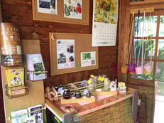 中ではご近所の案内パンフレット、お土産のブルーベリージャムやサフランティー、小さなお子様用の摘み取りバケツなどが並んでいます。