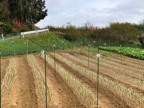 夏の間に貯めておいたペットボトルを使って大量の風車を作りました。中にオモリを入れて回るとカタカタを音を立てて振動が起こります。その振動が棒を伝って地中のモグラを追い払う・・はず。そして外から侵入しようとする鹿だってその音に怯える・・・はず。そう信じたい、そうでありますように。畑を囲む鹿よけは昨年より1m高い位置までワイヤーを張って対策しました。今年は侵入されませんように。