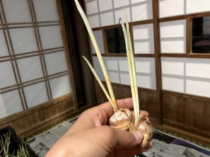 球根の掃除作業、これは来年の球根数や大きさが決まる大切な作業です。花が咲き終わった球根には沢山の芽が出ています。この芽から残す芽ととってしまう芽を選び掃除します。