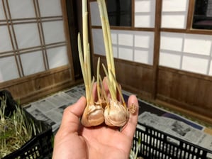 この球根を畑に植えておくと来年の春に新しい球根ができます。その数は残す芽の数なのです。数が少ないと大きな球根、数が多いと小さな球根になる為、今ある球根の大きさや状態と相談しながら残す芽を選びます。来年沢山の球根が欲しい、大きな球根が欲しいという気持ちとも相談です。今年は球根が全体的に小さかったので芽の数は1本か2本と決めました。3本と欲張らないで来年は大きな立派な球根を確実につくることにしました。球根の大きさは来年の花の開花率、花の数に影響します。