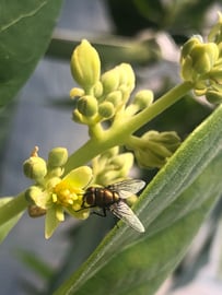 こんな感じのアボカドハウス。花もいっぱい、ハエもいっぱいです。次回のハエ孵化は何日後にしよう?その後どれくらいのペースで孵化させよう?念のため私も受粉手伝った方がいいかな?そんなことしたらハエのおかげか私のおかげか分からなくなる?と悩み多きところで一度ハウスに入ったら長時間ハエと戯れながら観察してられるくらい面白いアボカドハウスになっております。