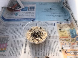 まずは孵化の方法。研究所やら販売元やらに電話して相談。要するに箱に入れて温度をかけてやると良いらしい。発泡スチロールの箱にペット用のホットカーペットを入れて新聞の分厚さで温度調整してその上にパックごとハエのさなぎを置きました。1000匹購入しましたがとりあえず半分の500匹を温め、残りは冷蔵庫に保存することに。